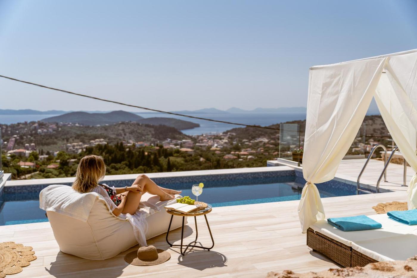Two-Bedroom Villa. This villas standout features are the pool with a view, hot tub and spa bath. Boasting a private entrance, this air-conditioned villa features 1 living room, 2 separate bedrooms and 2 bathrooms with a shower and a bidet. Guests can make meals in the kitchen that has a stovetop, a refrigerator, a dishwasher and kitchenware. Featuring a terrace with sea views, this villa also features a washing machine and a flat-screen TV with streaming services. The unit has 4 beds.